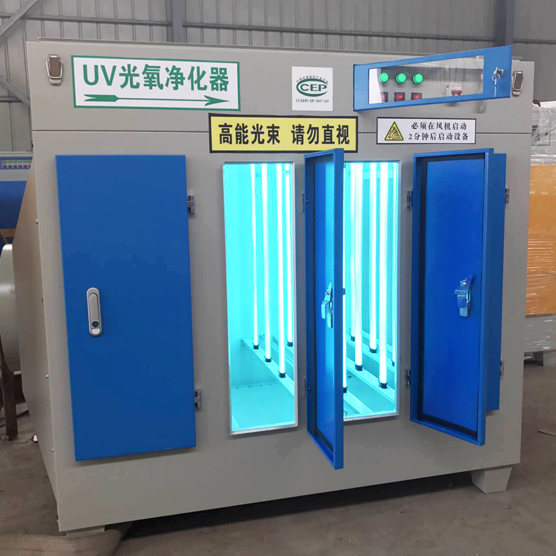 光氧净化器的结构是由壳体、紫外线灯管、过滤网、镇流器、电控箱组成的。光解氧化空气净化器一般安装在风机的前面,利用风机产生的负压将恶臭气体吸入到光氧空气净化设备后,净化设备运用高能C波光束及臭氧对恶臭气体进行协同分解氧化反应,使恶臭气体物质其降解转化成低分子化合物、水和二氧化碳,再通过排风管道排出室外。光解净化器也叫高能光量子除臭设备、高能离子除臭设备、光催化除臭设备、光催化氧化除臭设设备、活性氧废气净化设备、紫外光催化除臭设备,主要是通过紫外线光结合二氧化钛作为催化剂,对臭味分子行催化分解,变成无味气体,是目前一种应用广泛、除臭效果明显、性价比较高的除臭设备。